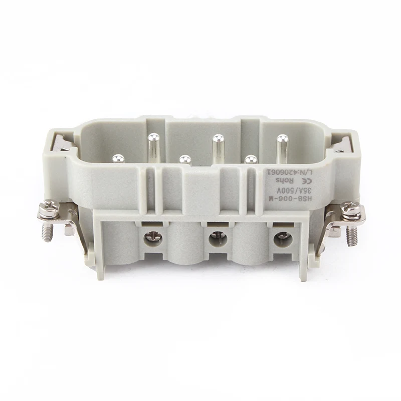 HSB-006-M ขั้วต่อ HSB สำหรับงานหนักทำงานภายใต้กระแสไฟ 35A .35A 6 Pin Insert Heavy Duty Connector คือ 6 พินหรือ 12 พินคู่เพื่อติดต่อกับสายไฟ เหมาะสำหรับสภาพการทำงานที่แตกต่างกัน และเป็นที่นิยมใช้ในอุตสาหกรรมอัตโนมัติและประเภทของการเชื่อมต่อสายไฟของเครื่องจักร