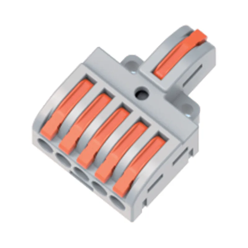 ตัวเชื่อมต่อด่วนแบบลวดต่อประกบหลายออกชนิด T ชนิด One-In ผลิตขึ้นโดยใช้วัสดุพีซีนำเข้าที่มาพร้อมกับมาตรฐานการจัดระดับ UL94 V0 ส่วนประกอบโลหะประกอบด้วยแผ่นนำไฟฟ้าที่ทำจากทองแดงเกรด T2 และสปริงที่ผลิตจากเหล็ก S301 ซึ่งรับประกันการนำไฟฟ้าที่ยอดเยี่ยม